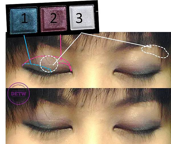 個人覺得畫這個妝眼線不要太重,不然顏色會被迫暈高會容易顯髒;我習慣上完眼線會再疊一次3號色上去,這樣藍色的偏光會比較明顯。